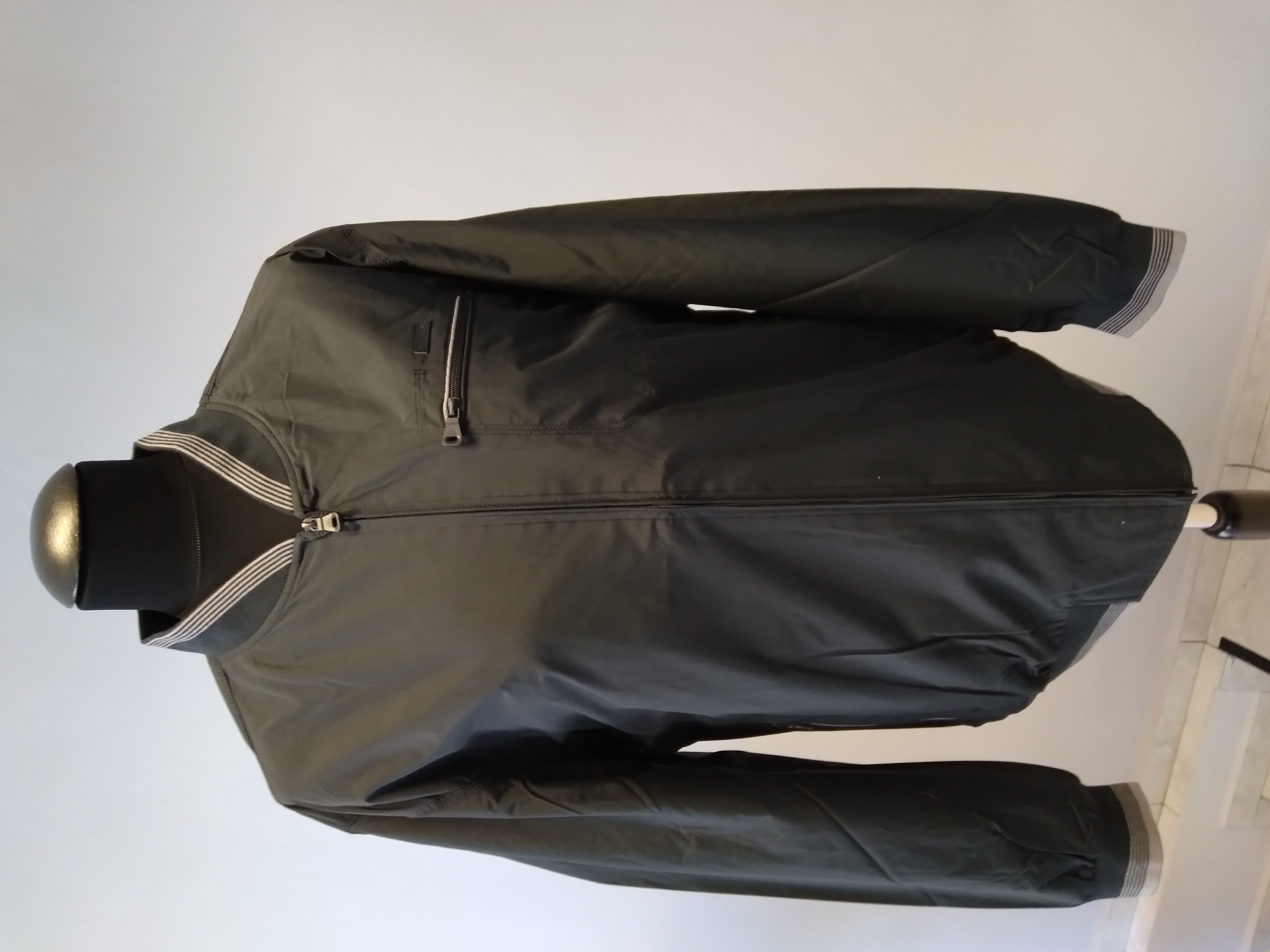 Uvnitř pánské přechodové bundy se na každé straně nachází náprsní kapsa, náprsní kapsa se také nachází zvenčí bundy na levé straně. Dále se na každé straně nachází kapsy. Bunda je v pase z poloviny do gumy, a to samé i na rukávech a krku.