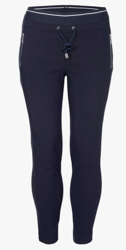 Tmavěmodré elastické kalhoty s ozdobným páskem a gumou v pase. Velice pohodlné, vhodné pro běžné nošení i slavnostnější příležitosti. Ozdobné kapsy na zip.