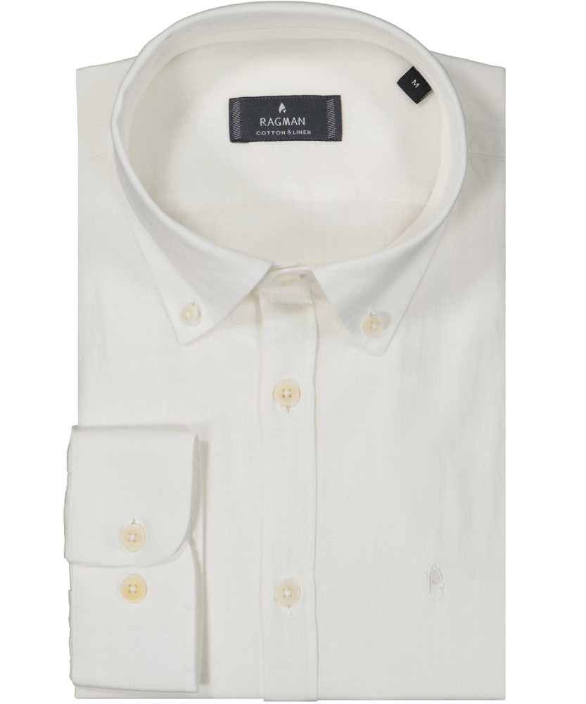 Bílá lněná košile s dlouhým rukávem, rovný střih. K dispozici také ve světle modré barvě.