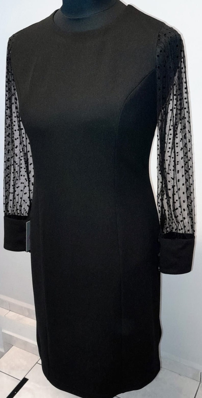 Černé pouzdrové šaty s transparentním rukávem vhodné pro slavnostnější příležitosti. Velikosti odpovídají českému číslování, na vyžádání Vám vybranou velikost rádi přeměříme.
