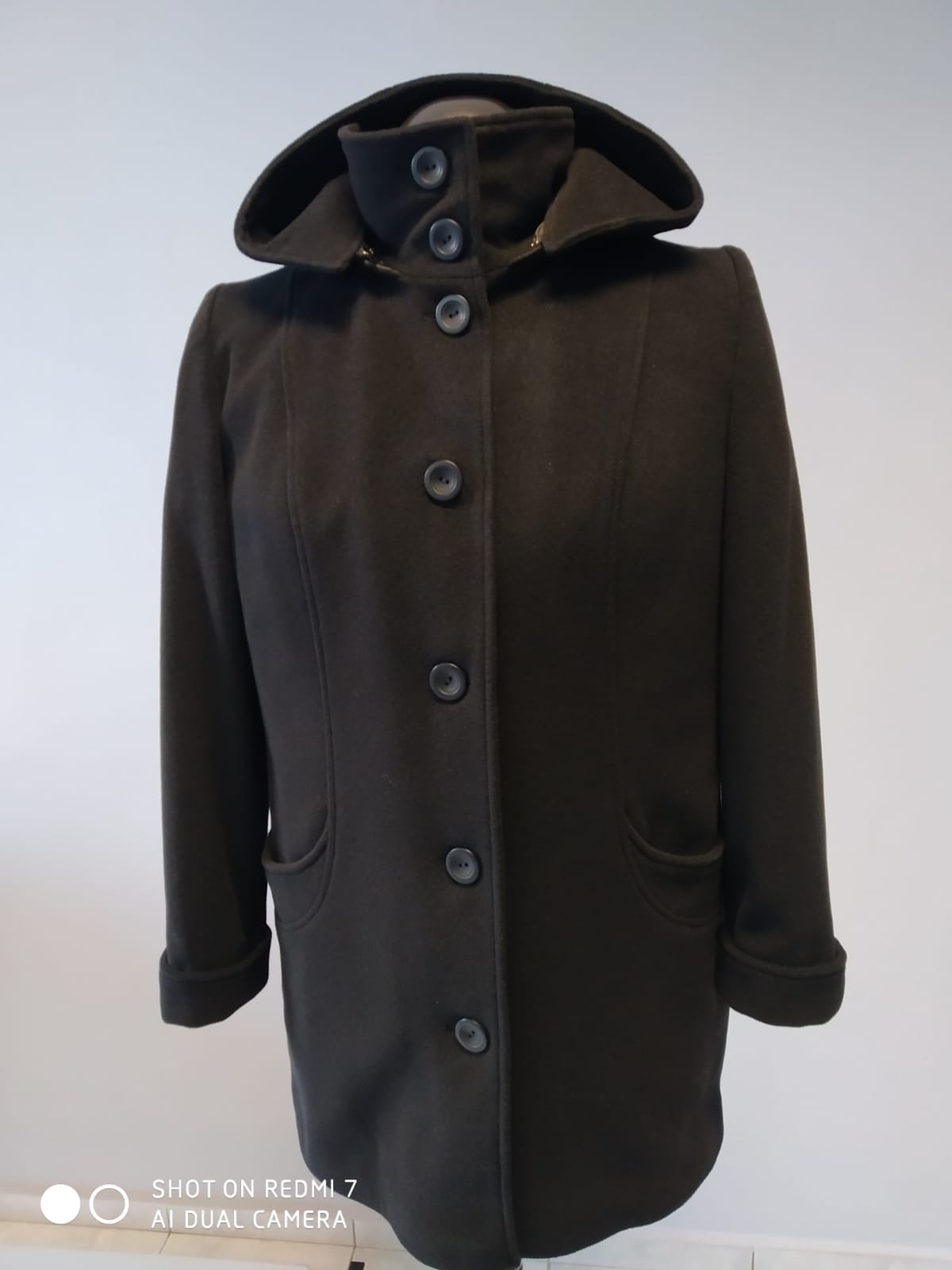 3/4 dámský flaušový kabát černý, zapínání na knoflíky, odepínací kapuce. Vyrobeno v České republice.