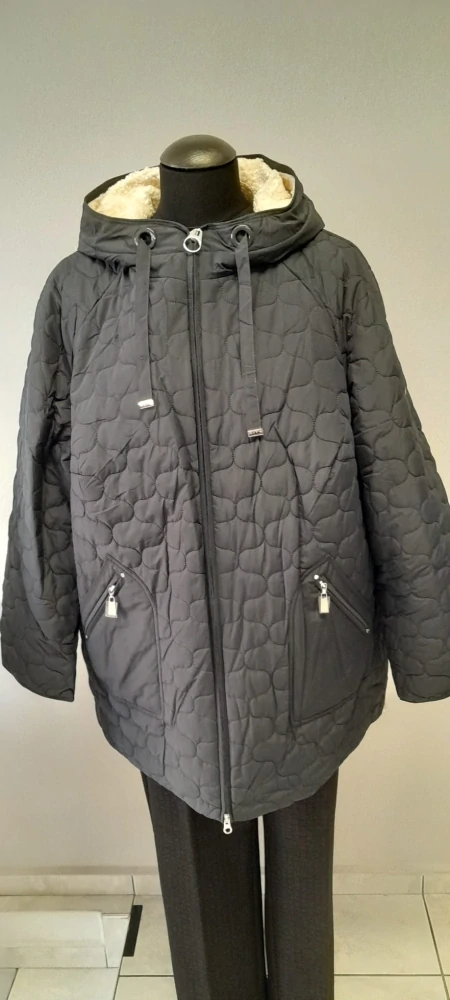 Dámská delší prošívaná bunda s neodepínací kapucí, mírně zateplená. K dispozici až do velikosti 62, velikosti odpovídají českému číslování.