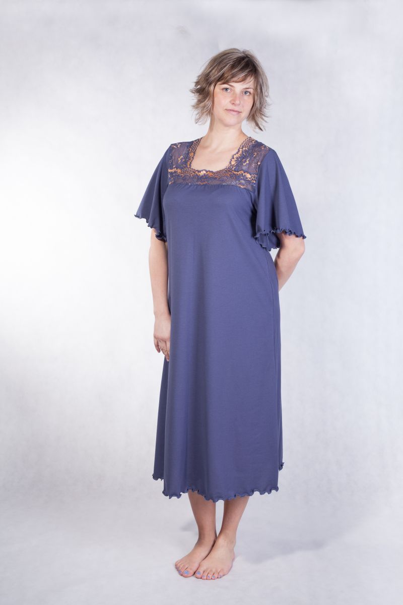 Dámská noční košile s krajkou v inkoustové barvě, krátký zvonový rukáv.