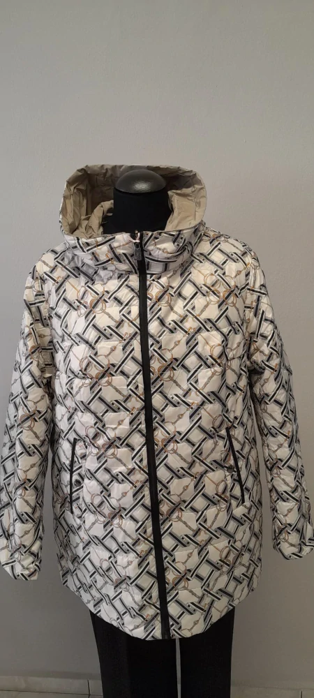 Dámská oboustranná bunda s neodepínací kapucí, mírně zateplená. K dispozici až do velikosti 64, velikosti odpovídají českému číslování.