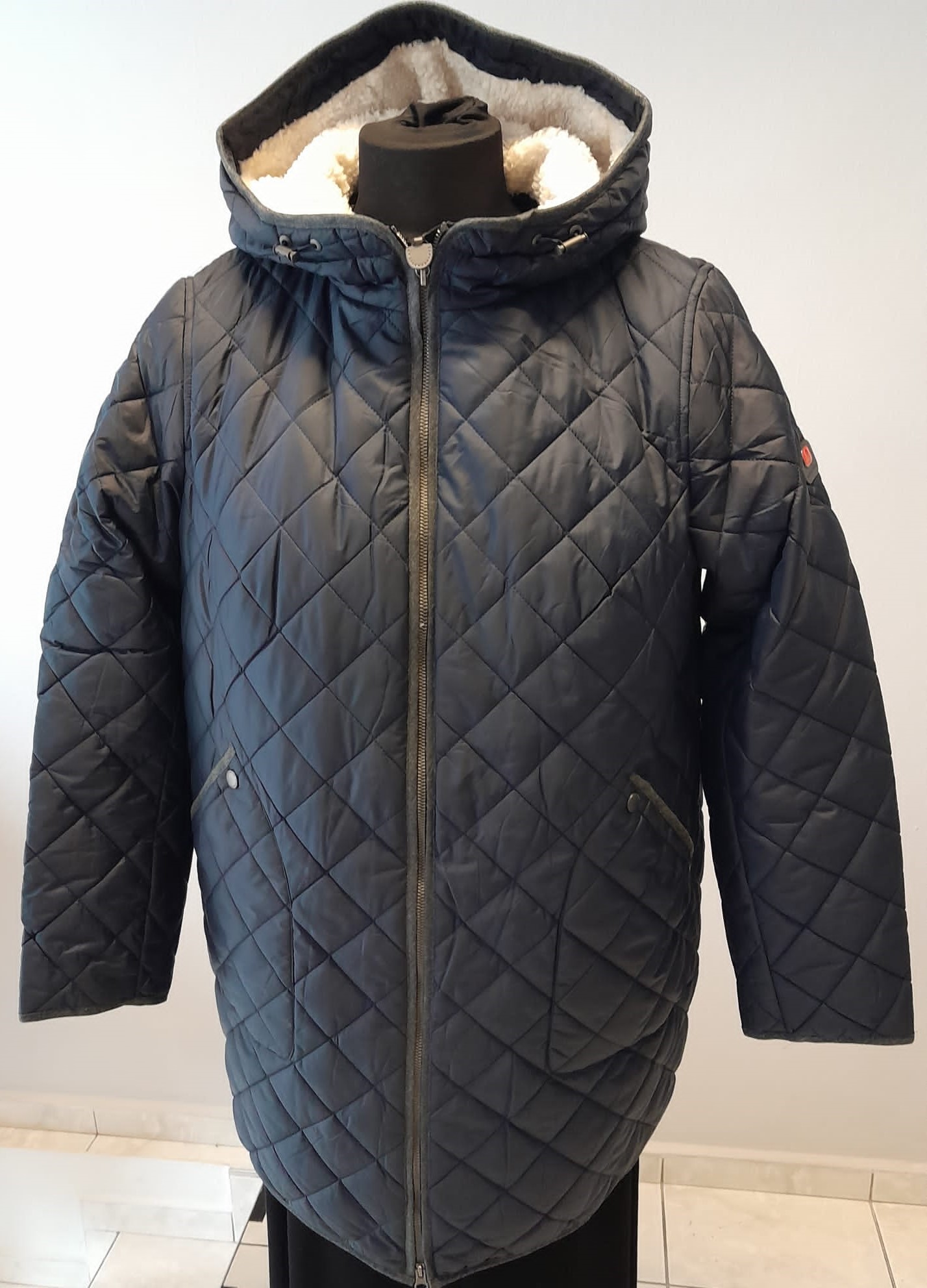 Dámská delší prošívaná bunda s kožíškem v kapuci, oboustranný zip, rovný střih. Kapuci nelze odepnout.