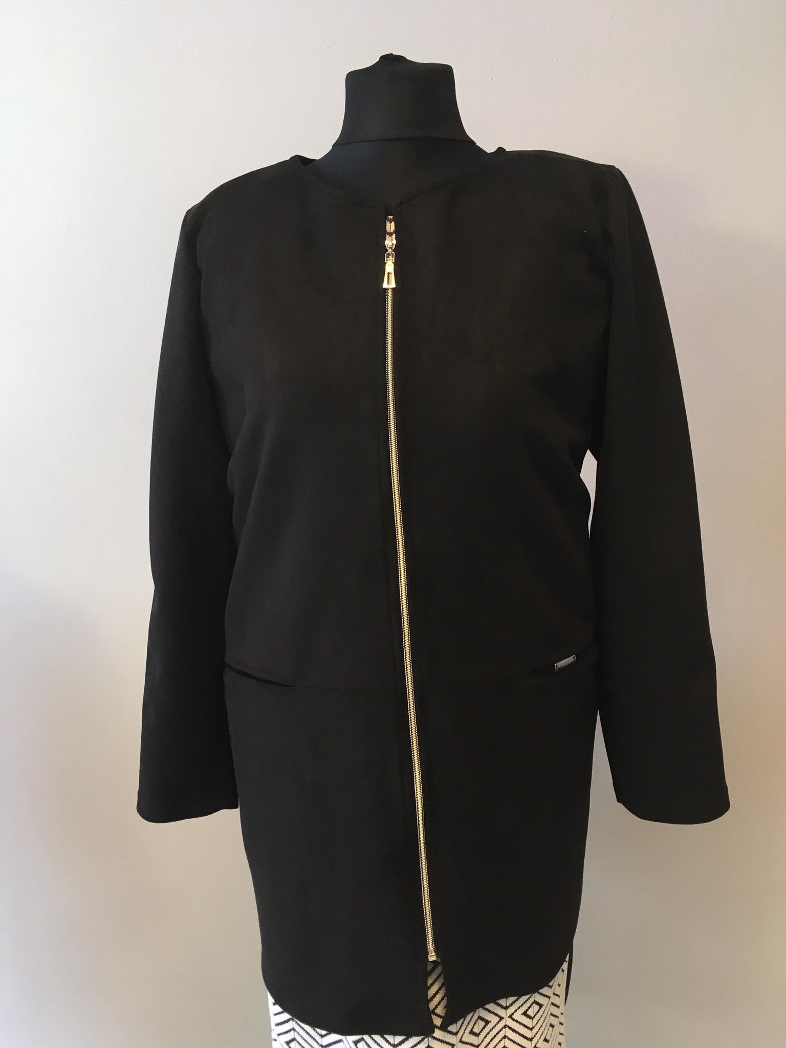 Černý kabátek (delší sako) se zipem - semišový omak. Hodí se k jakémukoliv typu oblečení, a to jak do práce, tak i do divadla. Velikosti odpovídají českému číslování, pokud chcete kabátek volnější, volte o číslo větší velikost. Na požádání Vám vybranou velikost rádi přeměříme.