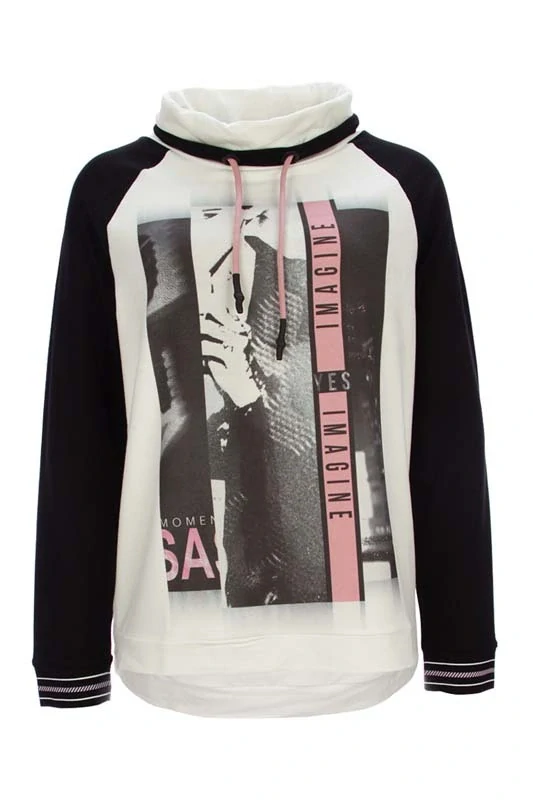 Tenčí bílá mikina s potiskem na předním díle a černými rukávy od oblíbené německé značky Kenny S. Délka ve velikosti 38 cca 62 cm.