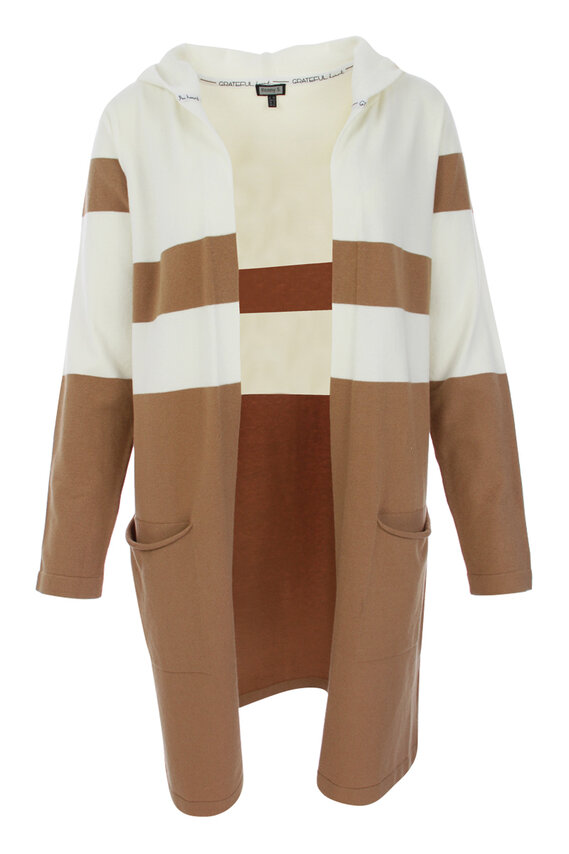 Dlouhý bílo-hnědý cardigan s kapucí z velice příjemného materiálu od oblíbené německé značky Kenny S, délka ve velikosti 38 cca 91 cm. Velikosti odpovídají německému číslování.