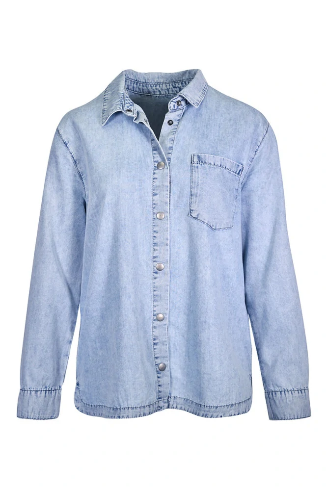 Košile v jeans looku od oblíbené německé značky Kenny S. V výstřih, volnější střih, náprsní kapsa. Velikosti odpovídají německému číslování. Přední délka ve velikosti 38 72 cm, prodloužený zadní díl.