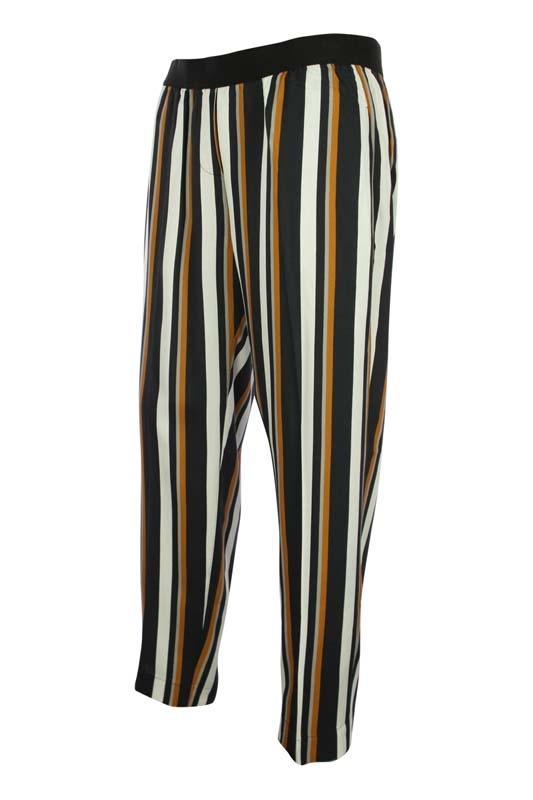 Jednoduché letní kalhoty s proužkem v zajímavé barevné kombinaci, mírně zúžený střih, postranní vsazené kapsy.