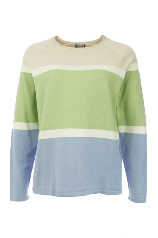 Pruhovaný tenký svetřík v pastelových barvách od oblíbené německé značky Kenny S. Rovný střih, délka ve velikosti 38 cca 63 cm.