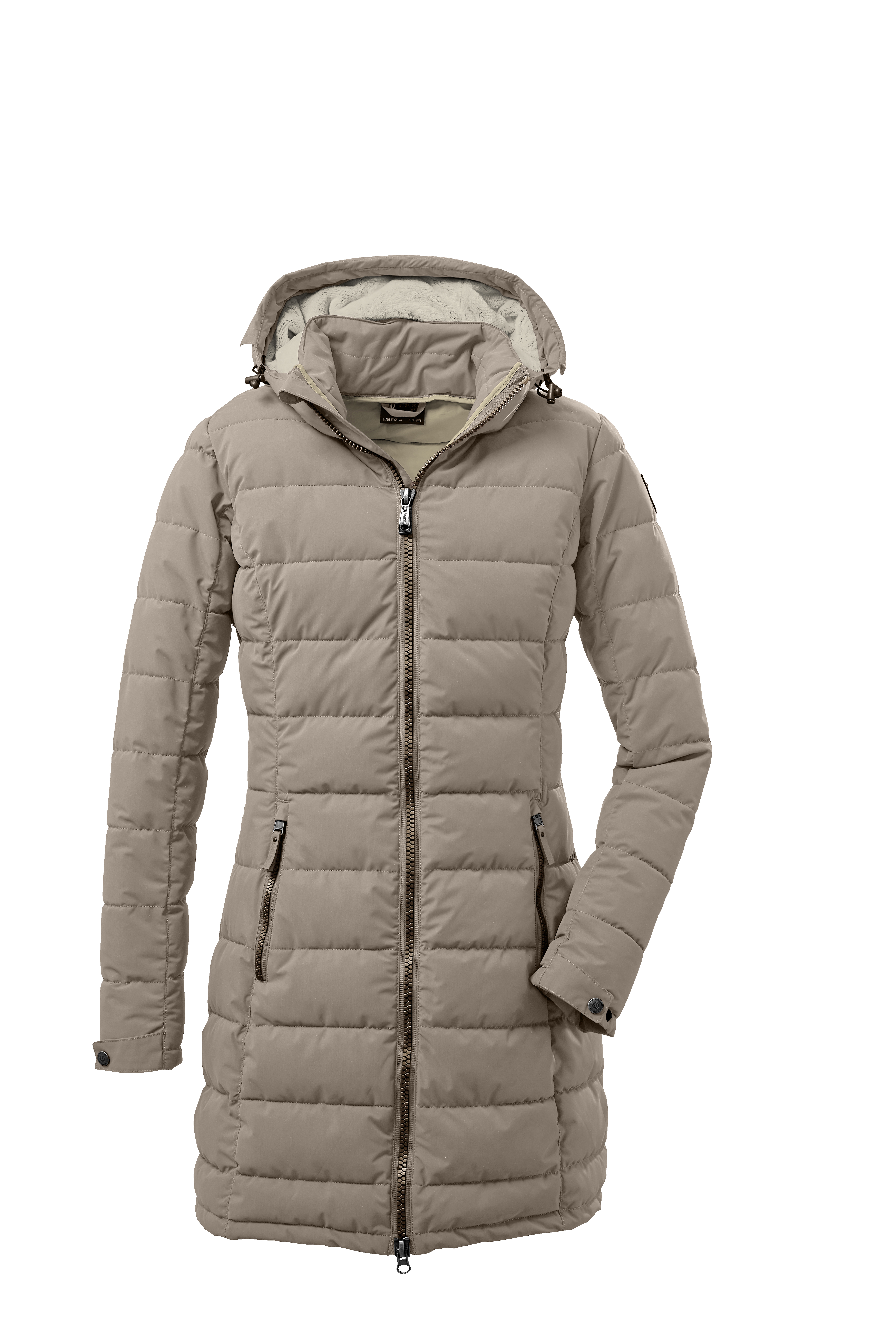 Dámský prošívaný kabátek v barvě bílé kávy od německé sportovní značky Killtec, vodní sloupec 8.000 mm, voděodolný. Délka cca ke kolenům. Velikosti odpovídají českému číslování.