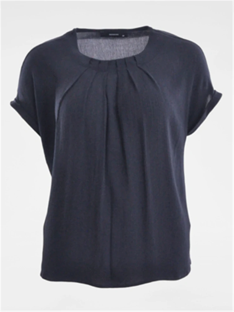 Tmavě modré triko se spadlým rukávem s řasením na předním díle od německé značky Navigazione. Velikosti odpovídají českému číslování.