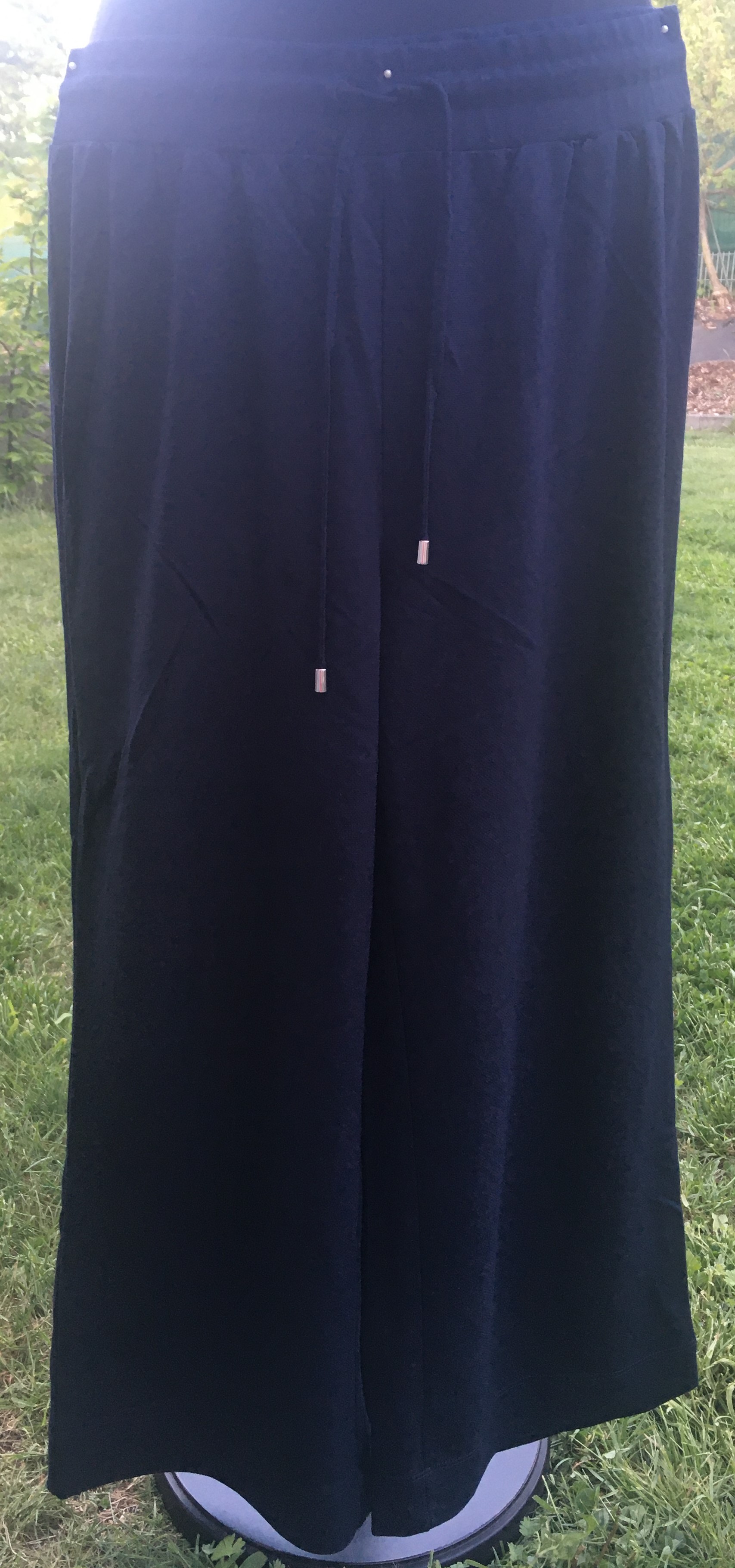 Tmavě modré letní kalhoty v pase do gumy z tenkého materiálu. Volnější rovný střih - doporučujeme volit o číslo menší velikost.