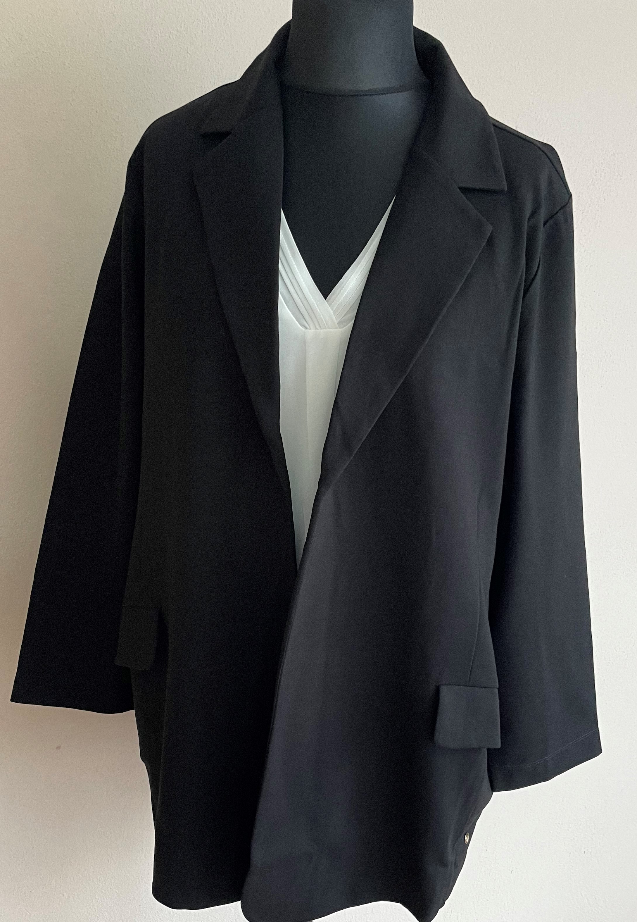 Delší černé sako volnějšího střihu od oblíbené německé značky Via appia, velikosti odpovídají německému číslování. Bez zapínání, na předním díle kapsa.