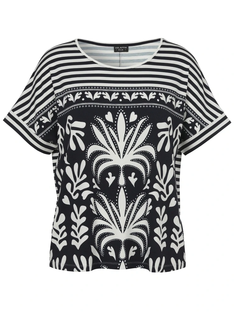 Dámské triko v modro-smetanové kombinaci barev od oblíbené německé značky Via appia. Volnější střih, spadlý rukáv, zadní díl pruhovaný. Velikosti odpovídají německému číslování.