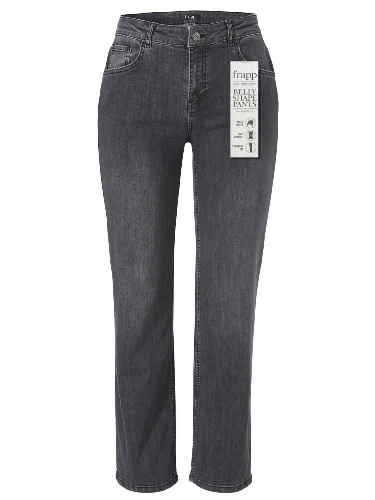 Tmavě šedé jeans s vsadkou od oblíbené německé značky Via appia, kolekce Frapp. Mírně rozšířený střih, v oblasti břicha stahovací vsadka, velice pohodlný střih tvarující postavu. Vyšší sed.
