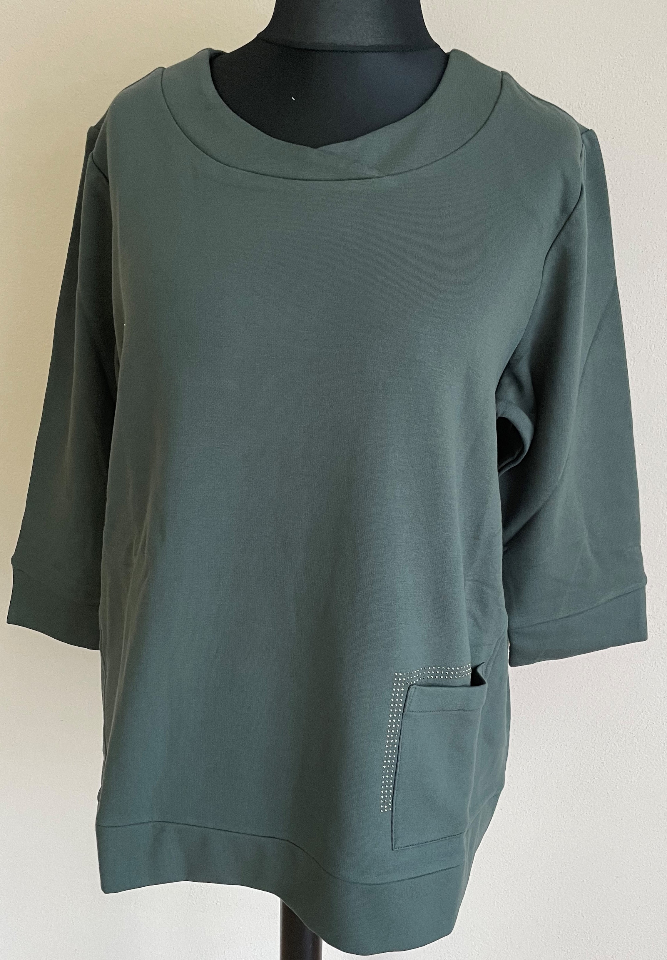 Lahvově zelená mikina se 7/8 rukávem od oblíbené německé značky Via appia , na předním díle ozdobná kapsa, širší rovný střih. Velikosti odpovídají německému číslování.