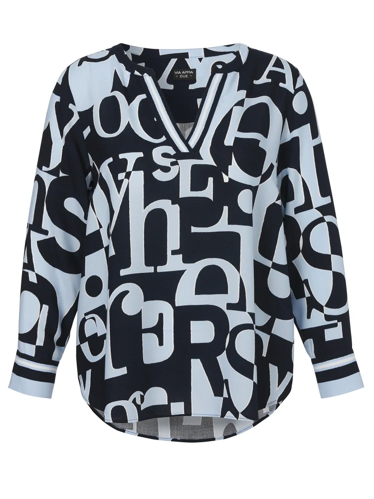 Modro-bílá halenka s dlouhým rukávem s potiskem od oblíbené německé značky Via appia, V výstřih, rukávy do manžety.