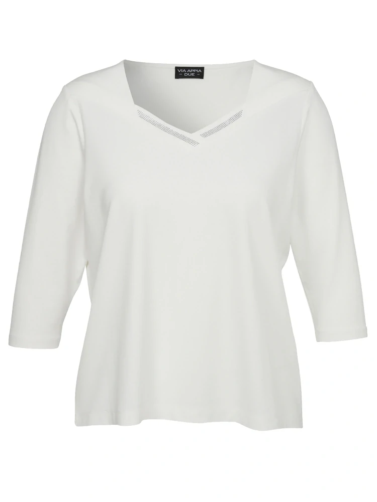 Smetanové triko s 3/4 rukávem s ozdobným V výstřihem od oblíbené německé značky Via appia, vhodné jak pro denní nošení, tak i pro slavnostnější příležitosti. Velikosti odpovídají německému číslování.