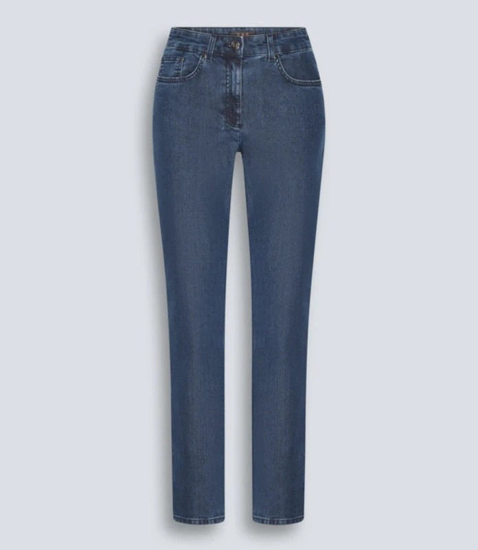 ZRS Kora byla speciálně navržena pro ženy se štíhlejšími stehny a nabízí nepřekonatelné pohodlí díky své standardní výšce pasu a diskrétně integrovanému elastickému pasu. Džíny úzkého střihu mají klasický design s pěti kapsami. Na zadních kapsách jsou malé ozdobné kamínky - viz foto.